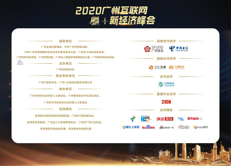 破局创新·加速突围|2020广州互联网+新经济峰会圆满收官持续了大半年的疫情,使得全球经济一度降速甚至停滞,对传统企业生产和线下消费造成了冲击,限制了人们正常的社交与工作方式。但在疫情的负面影响下,以“宅经济”、线上教育、在线问诊等新的经济增长点开始显现,传统实体经济也开始探索如何结合线上形式破局。 一场疫情,既是挑战,也是机遇。疫后时代,需求激增、新经济趋于活跃、产业蓄势待发,但疫情影响犹存,朝向数字化、智能化的路径发展成为企业转危为安的关键,5G、人工智能、大数据等新技术的赋能,也在加码互联网企业破局创新、逆势突围、转型升级。 8月26日,由广州互联网协会主办的2020广州互联网+新经济峰会在四季酒店如期举行,峰会采取“1+2+3+4+5”模式举行,即设置1场主峰会,2个闭门会议,3个发布仪式,4个颁奖典礼,5个热点专题论坛,以“破局·突围”为主题,特别邀请了50余位重磅嘉宾,包括信息化领域专家、高校学者、互联网名企代表、投融资机构及行业协会负责人等,通过线上与线下相结合的形式,与互联网从业者、产业链相关人士就新经济、新动能、新趋势等互联网产业热点话题深入探讨,为产业破局突围并实现高质量发展积极建言。